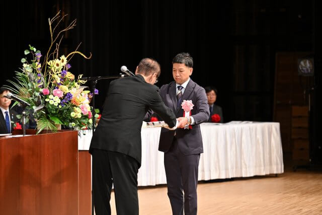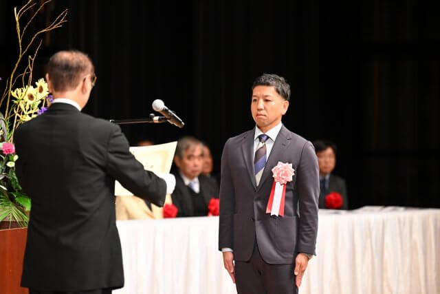 そして本式典では、旭市の発展に功績のあった個人・団体の表彰が行われ、当社前会長・故 小関敏男が表彰されました。受賞にあたり、代理として代表取締役 小関秀央が賞状を拝受いたしました。